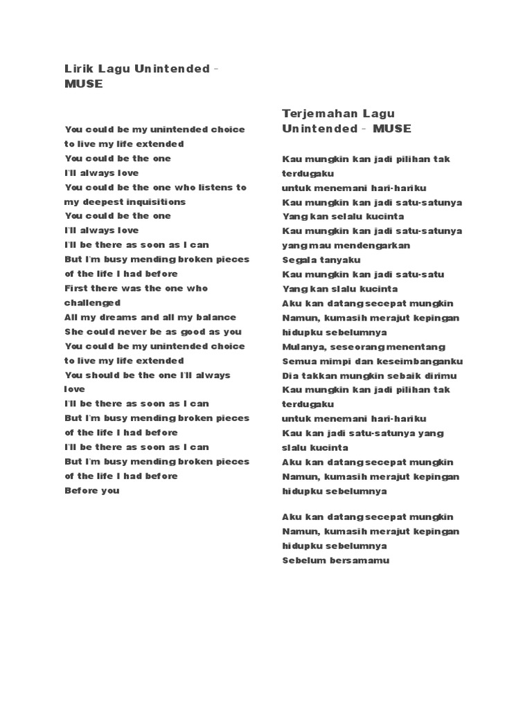 . Verse 1 You could be my unintended choice To live my life extended You could be the one Ill always love You could be the one who listens To my deepest inquisitions You could be the one Ill always love Chorus Ill be there as soon as I can But Im busy mending broken Pieces of the life I had before Verse 2. Lirik Lagu MUSE Unintended Lyrics. Muse - Unintended Lirik dan Terjemahan IndonesiaJangan lupa Like Comment dan Subscribe yaa.